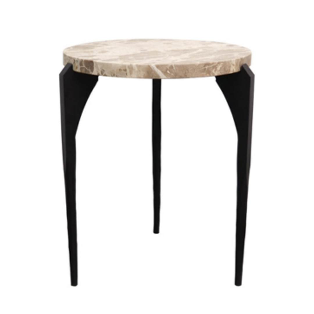 Introducing our Ariel Side Table, where every piece tells its own unique story. Crafted from exquisite beige-colored marble, each tabletop showcases its distinct patterns and veining, ensuring that no two pieces are alike. Elevating its elegance, the table sits atop slim-line tapered black metal legs of hand-forged steel, adding a modern twist to its timeless design. Redefine your space with the unparalleled beauty and charm of this exquisite piece.