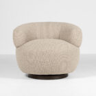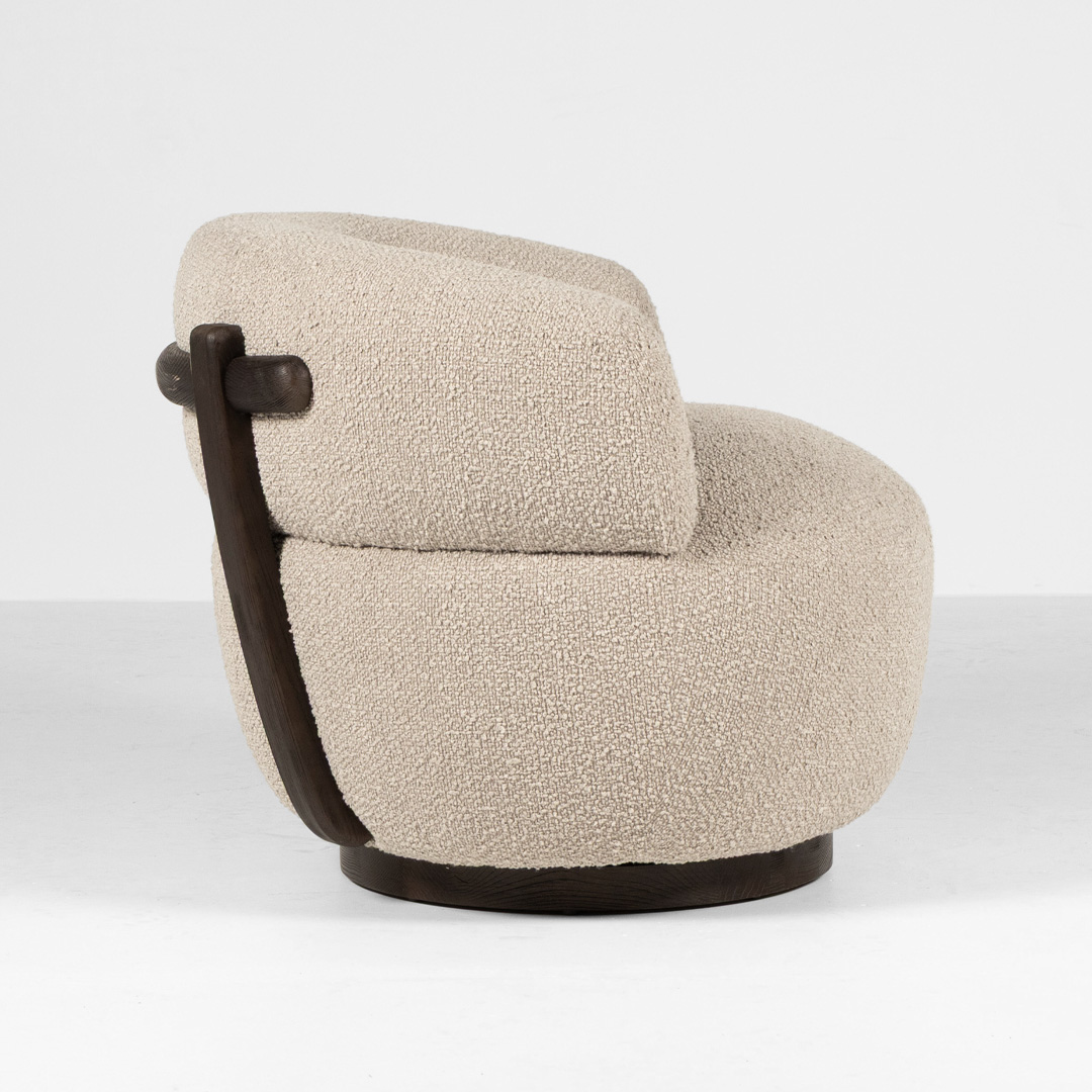 Generous proportions and a tactile polyester fabric combine in this delightful swivel chair. The dark timber swivel base is complemented by timber detailing on the back of the chair. Available in a neutral fog colour.