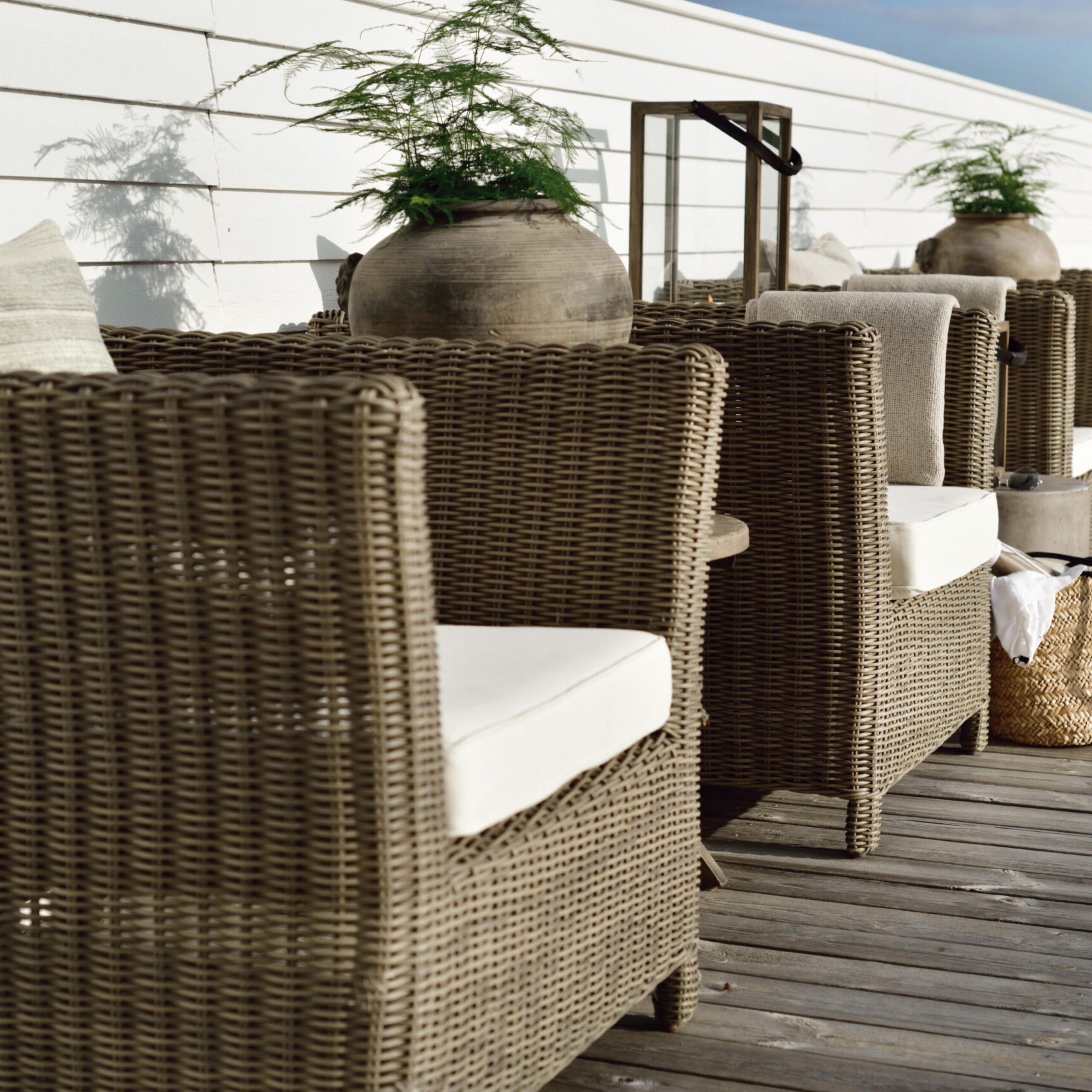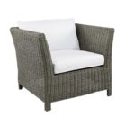 Classic wicker style furniture, created on a rustproof powder coated aluminium frame using handwoven polyethylene weave that combines a classical natural “vintage” finish with extreme durability. Complemented with outdoor cushions in quick dry foam and solution dyed acrylic fabric.