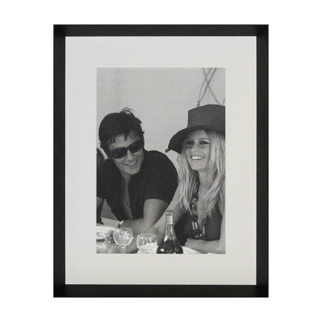 Step into the effortless glamour of Saint-Tropez in 1968 with this captivating print. Brigitte Bardot and Alain Delon share a sunlit moment at a table, laughing over drinks. The image captures the golden age of French cinema and the timeless allure of two icons at ease in their element.