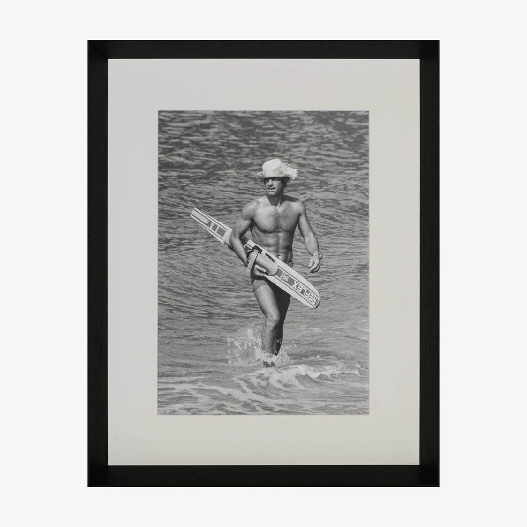 Bring a touch of cinematic summer to your space with this timeless print. Jean-Paul Belmondo walks out of the water on the set of Le Magnifique in Mexico, skis under his arm and straw hat tipped just so. His effortless charm and relaxed confidence capture the carefree elegance of 1970s leisure, making this piece a stylish nod to classic French cool.