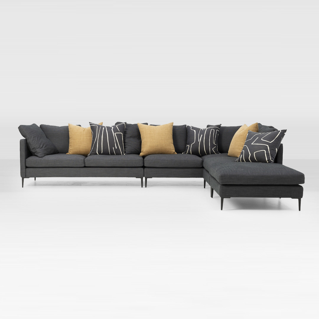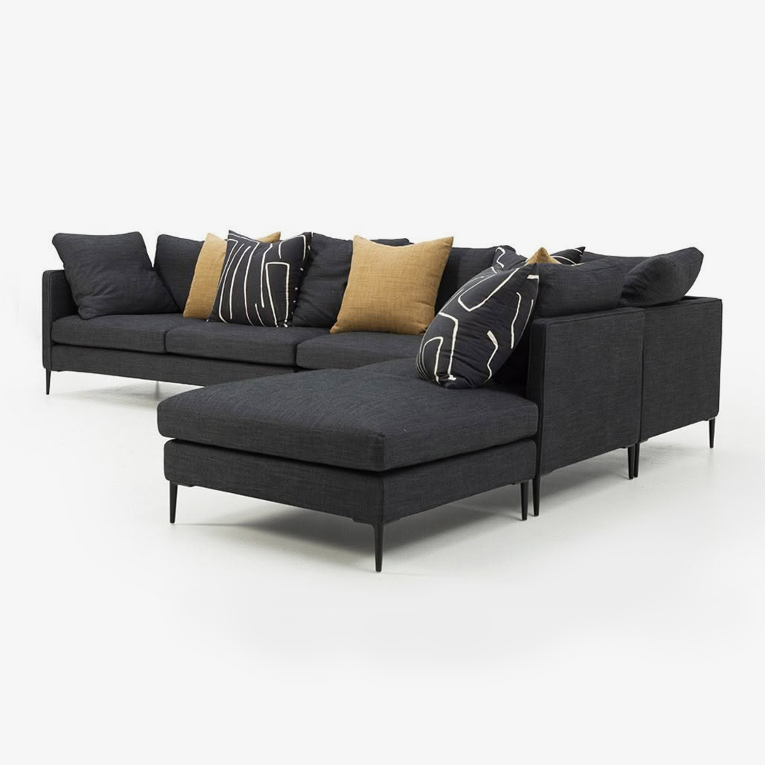 Modern modular sofa with loose seat and back cushions. Sleek matt black aluminium leg. Made in your choice of fabric, leather and size. Exclusively Made in New Zealand