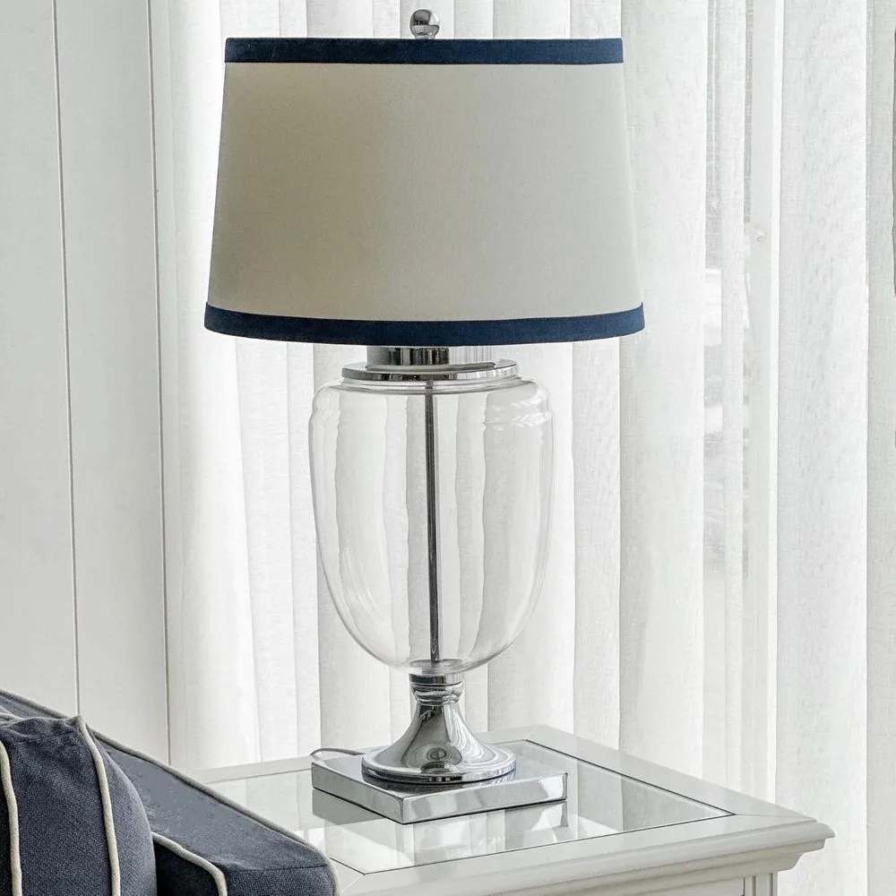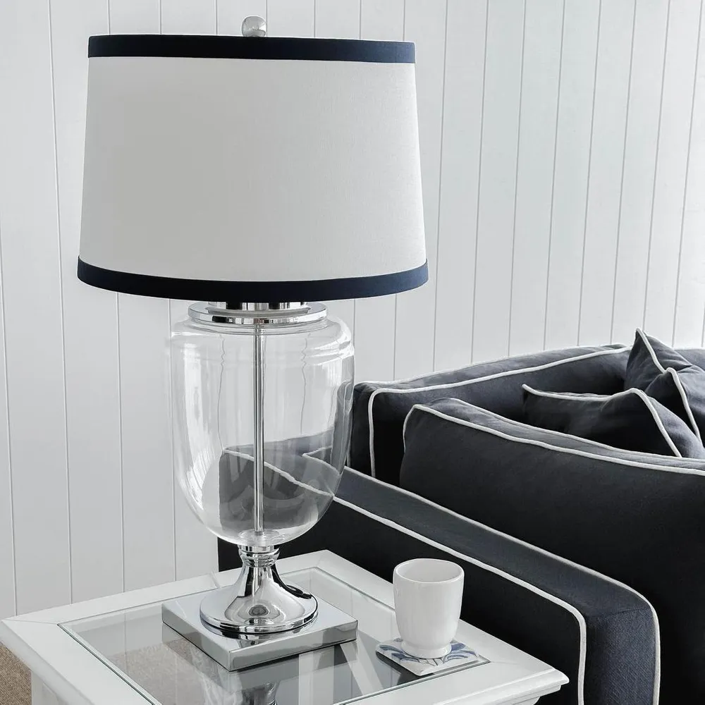 Brighten up your room with coastal charm and sophistication courtesy of our Charlotte Glass and Nickel Lamp. With its sleek glass base, crisp white linen shade, and Hamptons-style navy trim, this lamp effortlessly blends timeless elegance with modern flair. Crafted from high-quality materials, it promises to add a touch of refinement to any room, whether placed on bedside tables, living room consoles, or office desks.
