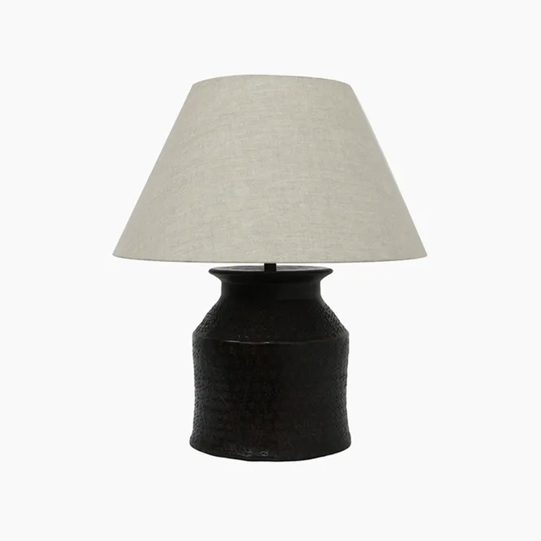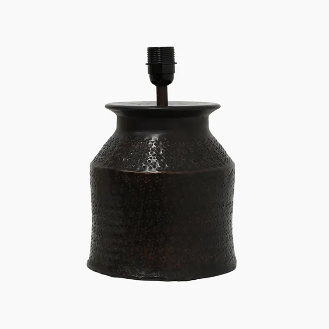 The Ennis Patterned Lampbase features a distinctive primitive shape with a robust, chunky design. Its aged brass finish is accentuated by a unique beaten bindi imprint, offering a blend of vintage charm and character. Perfect for use as a desk lamp or a bedside accent, this versatile piece complements a wide range of interior styles with its timeless appeal.