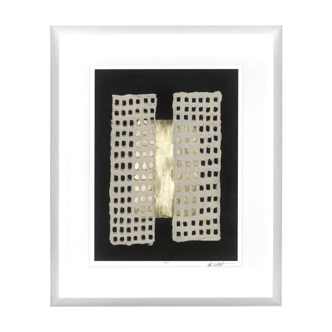 Introduce understated luxury to your walls with this elegant abstract print. A rich gold rectangle anchors the centre of a deep black background, intersected by two soft cream grids. The composition blends precision and warmth, creating a refined balance that enhances any contemporary interior.