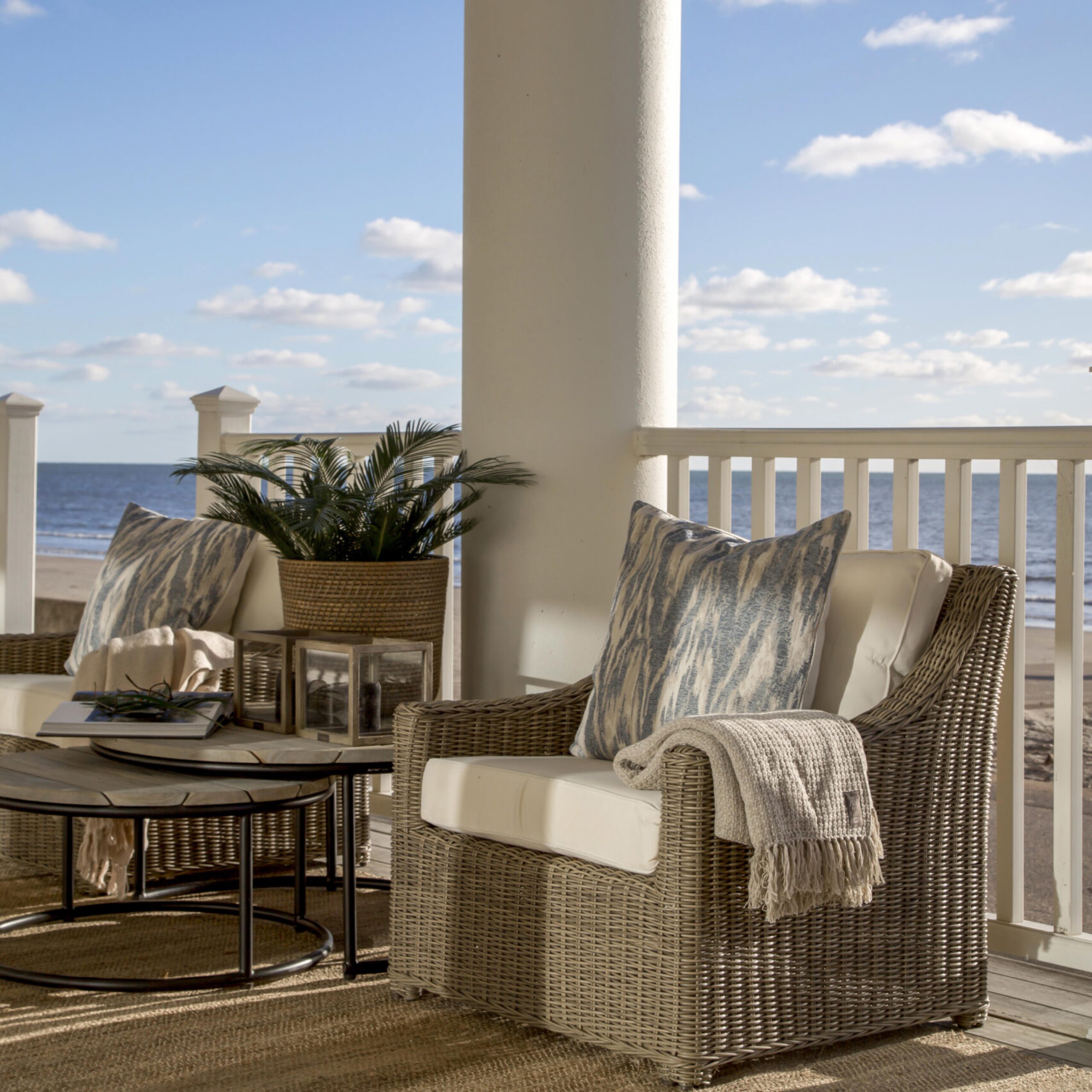 Classic wicker style furniture, created on a rustproof powder coated aluminium frame using handwoven polyethylene weave that combines a classical natural “vintage” finish with extreme durability. Complemented with outdoor cushions in quick dry foam and solution dyed acrylic fabric.