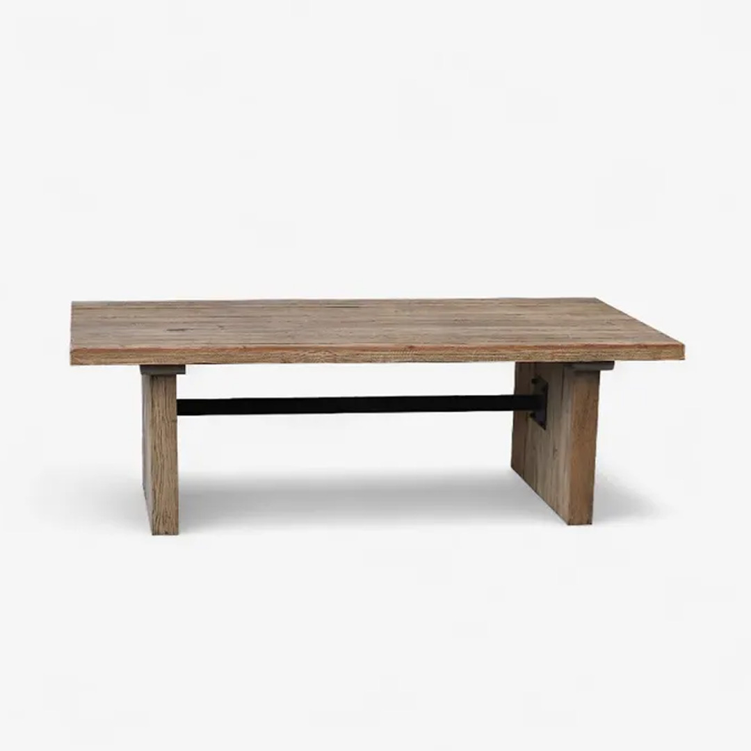 The Malachi coffee table is a large, solid wood coffee table made from a combination of oak wood, and oak veneer, with a simple, structured leg design that features a solid wooden bar that adds visual interest.