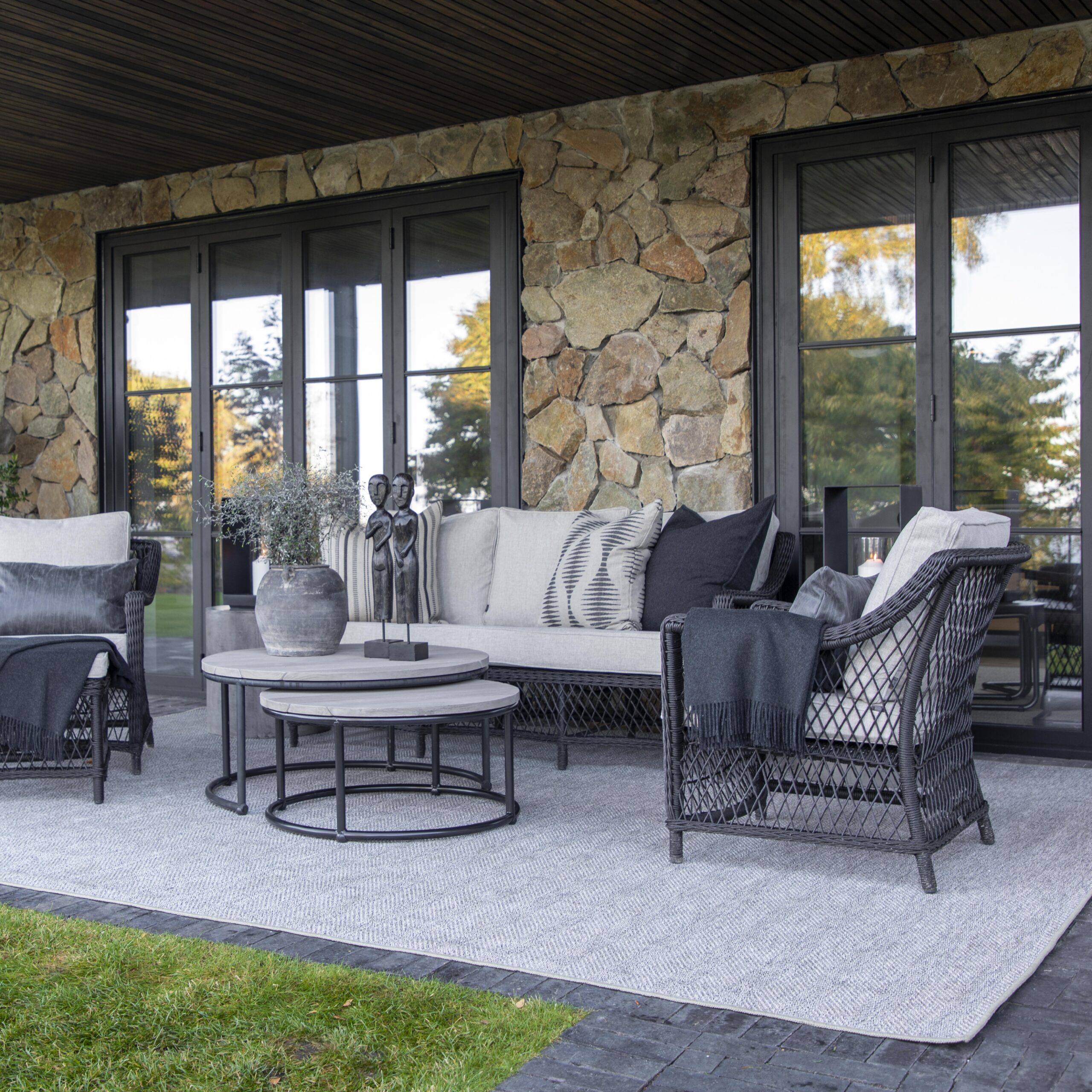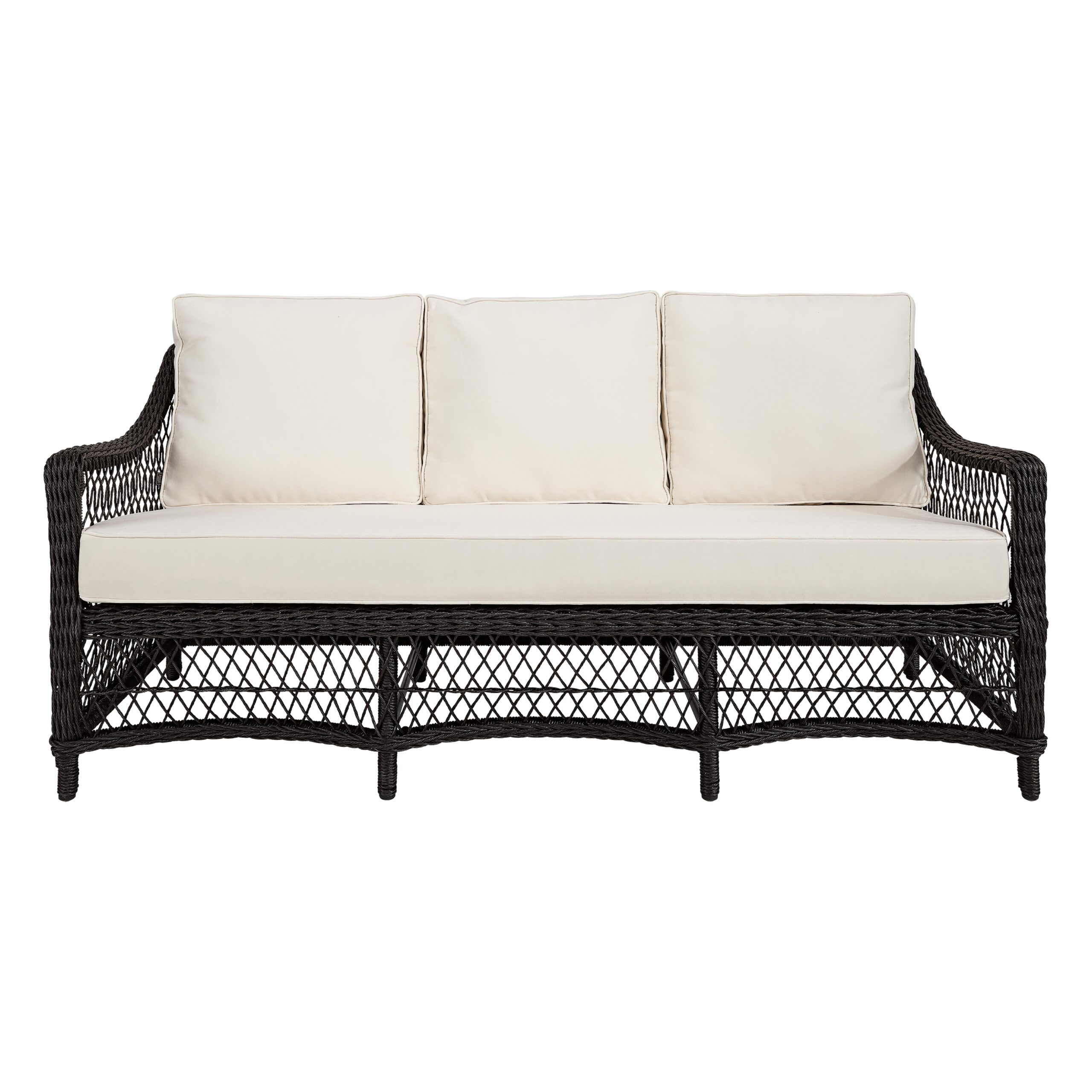Classic wicker style furniture, created on a rustproof powder coated aluminium frame using handwoven polyethylene weave that combines a classical natural “vintage” finish with extreme durability. Complemented with outdoor cushions in quick dry foam and solution dyed acrylic fabric.