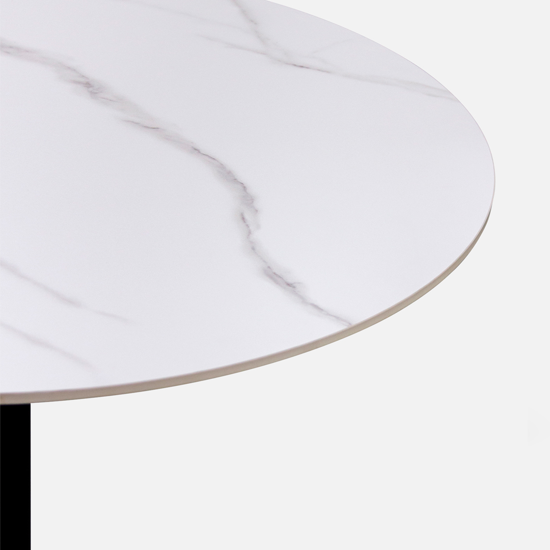 The MASCA round dining table is a testament to space-savvy elegance. Crafted from aluminum and adorned with a stunning white sintered stone top, Sintered stone tables offer great heat protection and cold resistance, allowing you to directly place hot cups of tea or coffee onto their surface without causing any long-lasting damage. It is also stain and scratch-resistant, making it easy to clean and upkeep while still remaining aesthetically pleasing.