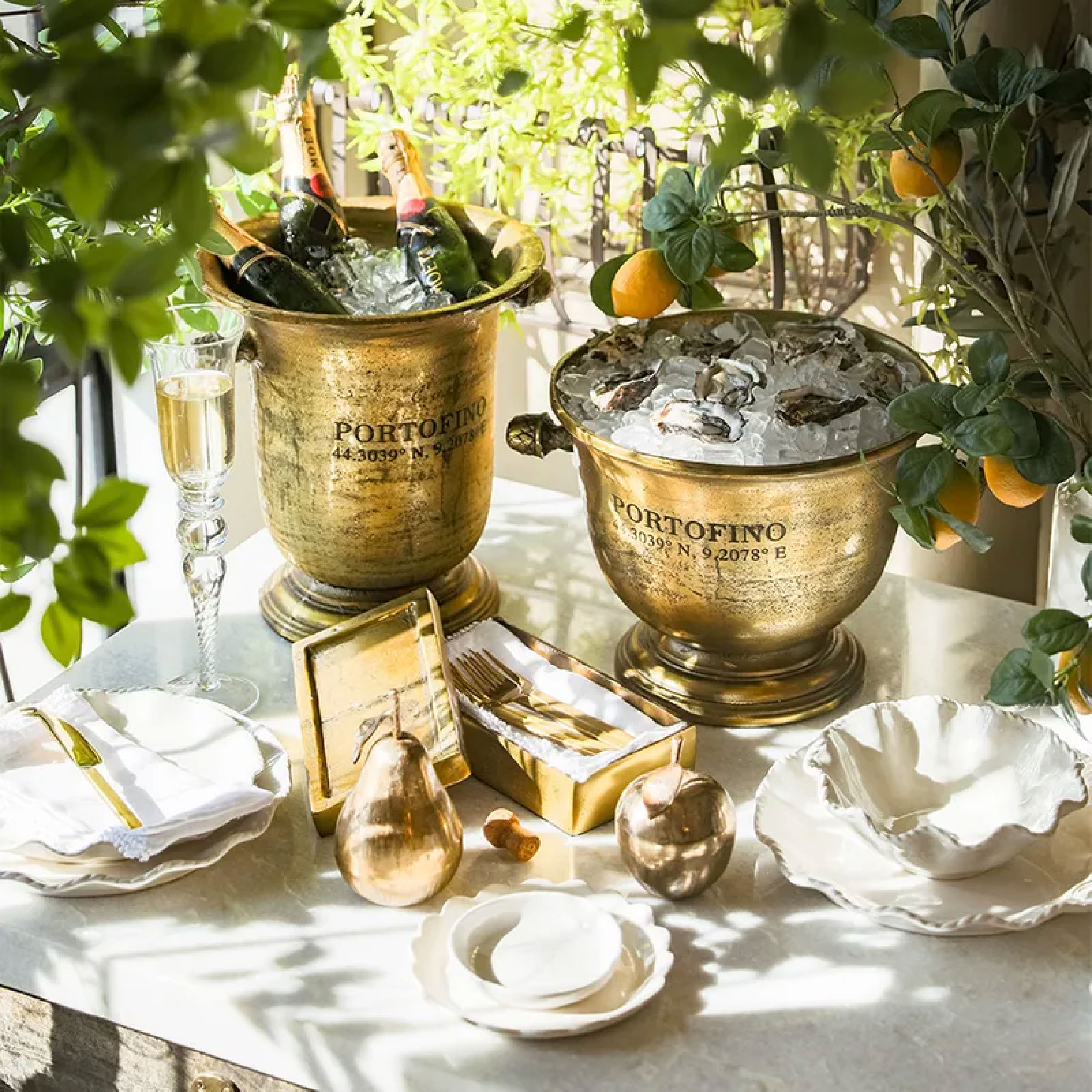 Entertain in style with the Portofino Champagne Bucket. Featuring a stunning antique gold finish, it adds a touch of elegance to any gathering, from cosy dinners to festive celebrations. This wine bucket not only keeps your beverages perfectly chilled but also serves as a beautiful centrepiece for your bar or dining setup. Available in two sizes.