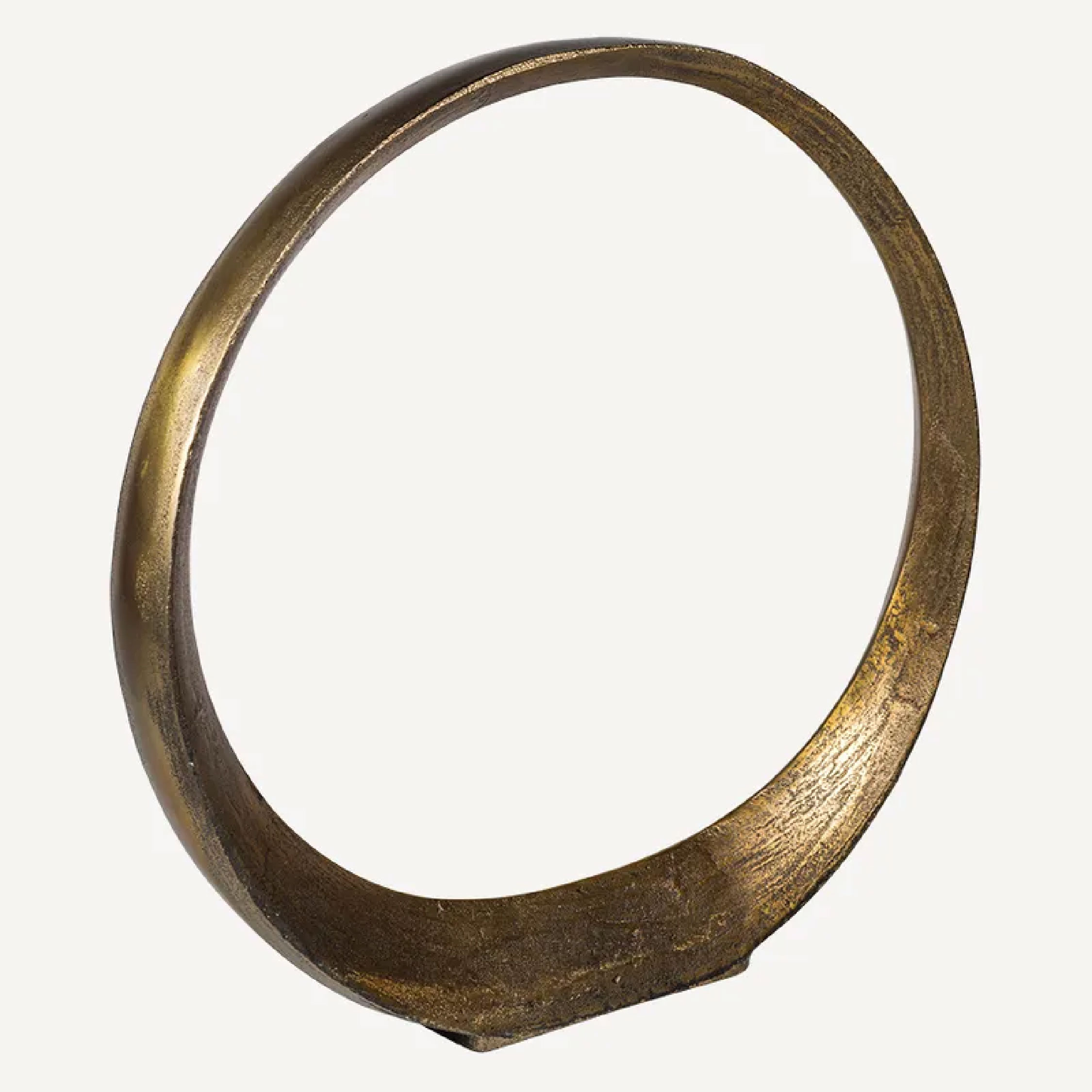 The ring sculpture is like a piece of art, enduring and timeless. It is cast in solid aluminium and finished in a soft antique gold colour. Stand alone or with all three sizes.