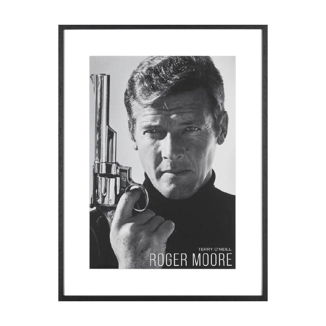 Bring classic cinematic cool to your space with this striking black-and-white portrait. Roger Moore stands poised, gun angled skyward by his side, his serious expression and timeless hair framed by dramatic shadows. The high-contrast composition and sleek black turtleneck create a bold, sophisticated focal point that captures both elegance and intrigue.