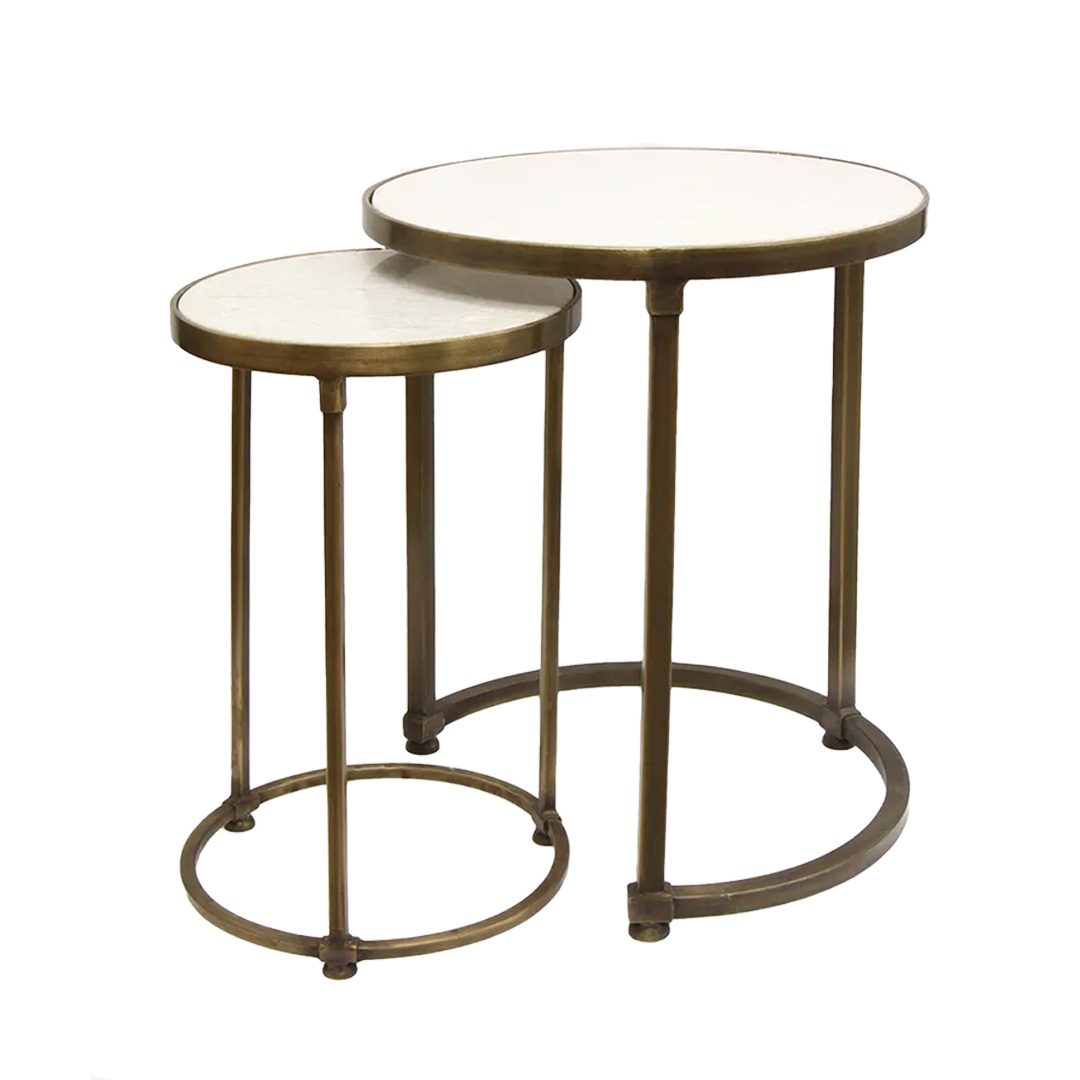 Add versatile elegance to your living space with this chic nesting table set from French Country Collections. Crafted from iron with luxurious gold finish accents and topped with smooth marble surfaces, these tables blend glam and functionality effortlessly. No assembly required—simply nest when not in use or pull them apart for extra surface space.
