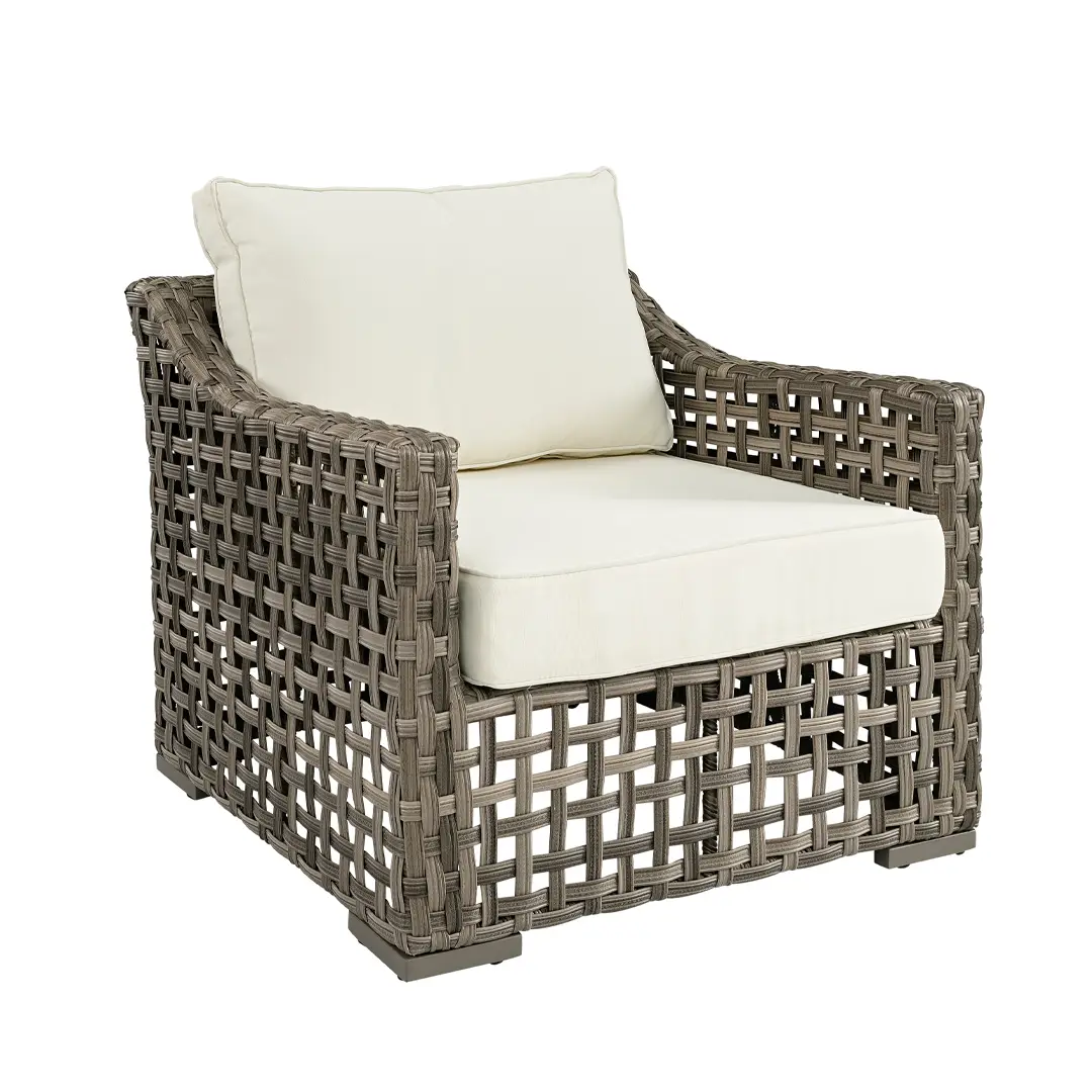 Classic wicker style furniture, created on a rustproof powder coated aluminium frame using handwoven polyethylene weave that combines a classical natural “vintage” finish with extreme durability. Complemented with outdoor cushions in quick dry foam and solution dyed acrylic fabric.