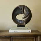Add a touch of modern artistry to your space with this unique oxy black sculpture, featuring a striking, abstract shape mounted on a sleek base. The oxidised black finish enhances its bold, sculptural form, creating a dynamic visual appeal that captures attention from every angle. Its distinctive design and sophisticated finish makes it perfect for any contemporary or minimalist setting. This sculpture works beautifully as a centrepiece on a coffee table, mantel, or sideboard.