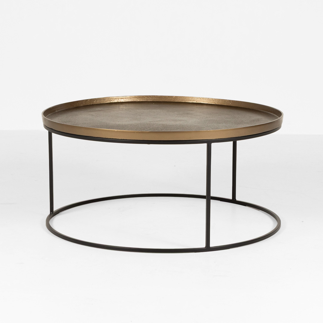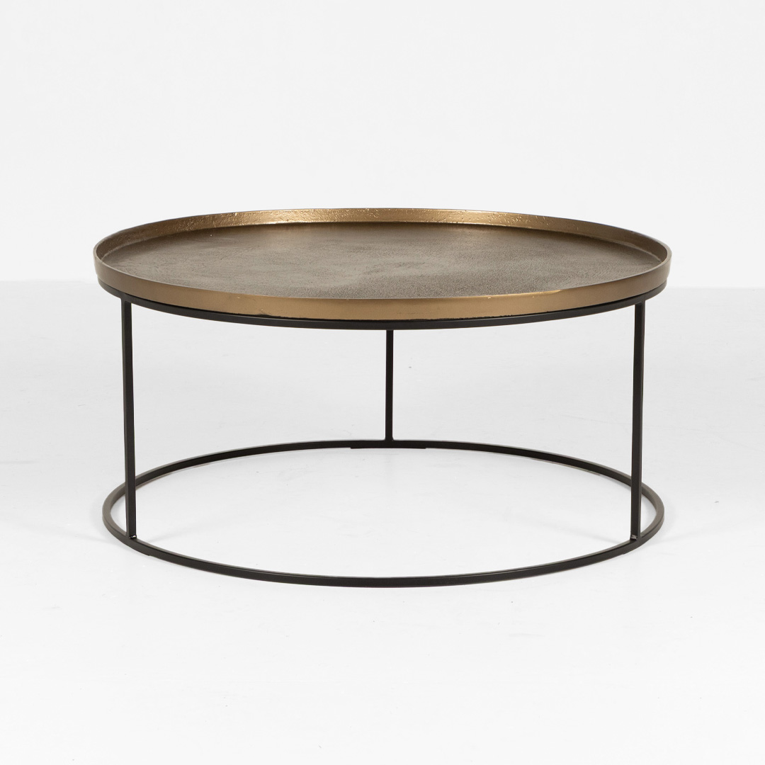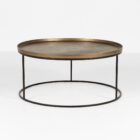 Elevate your living space with the Soho Round Coffee Table, featuring an antique brass top and sleek black legs. This stylish blend of metal and matte finishes creates a modern, industrial look—perfect for contemporary or eclectic interiors.