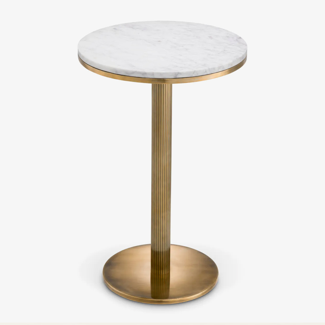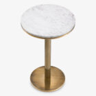 The luxurious white marble round top, enhanced with an iconic vintage brass finish, radiates sophistication perfect for any space.